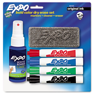 - Includes EXPOŽ eraser, 2-oz. bottle of EXPOŽ formula cleaner and four markers.
