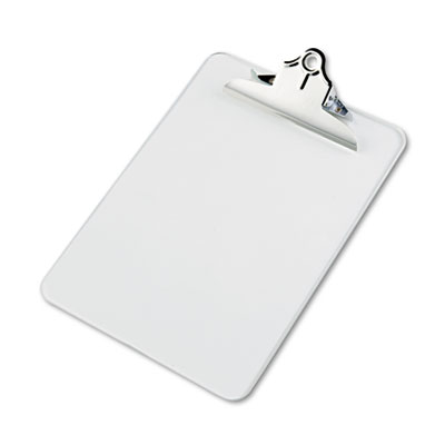 A clear choice for durable organization, this clipboard is made of shatterproof plastic. Great for offices as well as factories, warehouses and construction sites. 6" wide steel clip. Hanging hole. Holds Paper Size: 8 1/2 x 11; Clipboard Actual Size: 9w x 1 3/4d x 13 1/4h; Clipboard Material: Plastic.