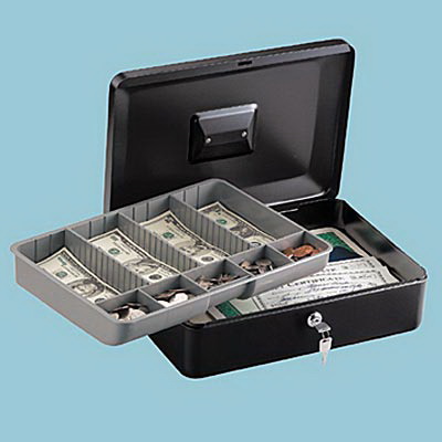 Product Description: 14" Safebox ? Key lock with two keys ? Durable enamel finish ? Removable money tray Nine-compartment tray has adjustable dividers. Store cash, valuables or important documents. Fold-away handle. Rounded corners. 14-3/16w x 10-1/32d x 4-1/2h. Black