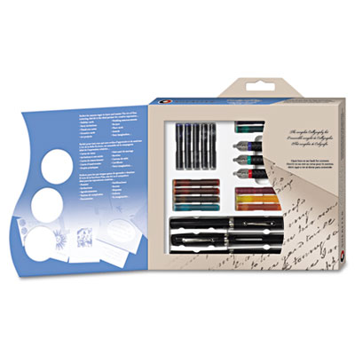 Perfect for the dedicated calligrapher or the beginner, this pen set offers a variety of nib choices as well as an instruction book that outlines four easy steps to calligraphy. The generous assortment of ink cartridges allows for the use of multiple colors on a project without cleaning the pen. Ink Color(s): 2 Black; 2 Blue; 16 Assorted; Barrel Color(s): Black; Pen Set Type: Calligraphy.