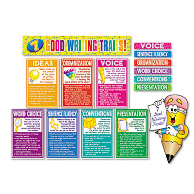Guide students toward better writing. This set provides seven good writing traits, complete with definitions and checklists. Includes cute pencil character and "7 Good Writing Traits" banner. Theme: 7 Good Writing Traits; Width: 12".