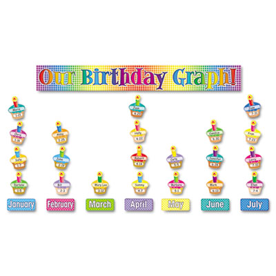 - Contains 30 student cupcakes, 12 monthly signs, "Our Birthday Graph!" banner and confetti accents.