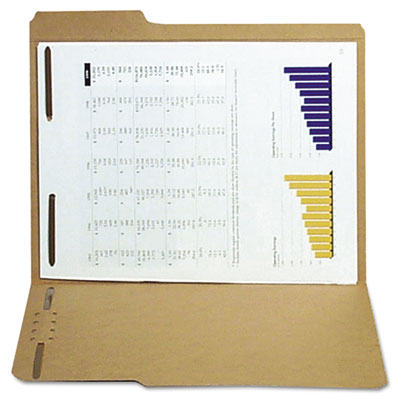 Strong yet economical folders have 2" capacity metal fasteners to hold papers securely. 11 pt. Kraft is more durable and shows less wear than standard Manila folders. File Folder Type: Top Tab; Size: Letter; Folder Material: 11 pt. Kraft.