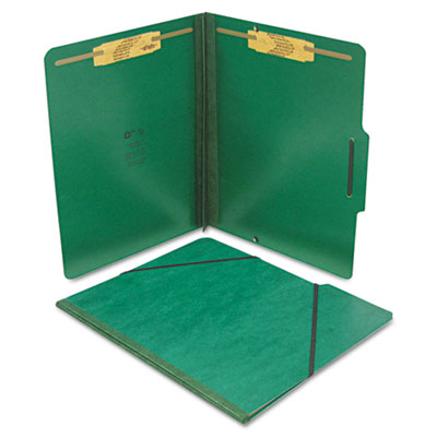 Ideal for binding thick stacks of documents in one file. Moisture-resistant, embossed finish 25 pt. pressboard covers with 2" capacity fastener inside front and back to secure paperwork. Reinforced gusset for durable expansion. Elastic closure keeps papers neat. 1/3 cut tabs in assorted positions. Classification Folder Type: Top Tab; Size: Letter; Number of Sections: 2.