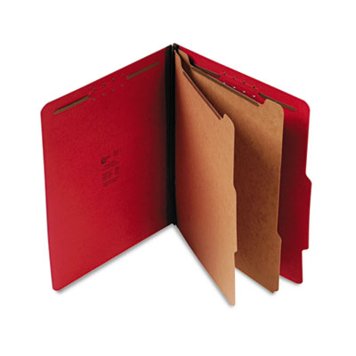 Keep projects organized with folders featuring 25 pt. pressboard covers with 2" capacity metal fasteners inside front and back. Two 17 pt. Kraft dividers with double-sided 1" capacity fasteners and tabs for classification within the folder. TyvekŪ gusset delivers durable expansion. Covers have 2/5 cut tabs, right of center. Classification Folder Type: Top Tab; Size: Letter; Number of Sections: 6.