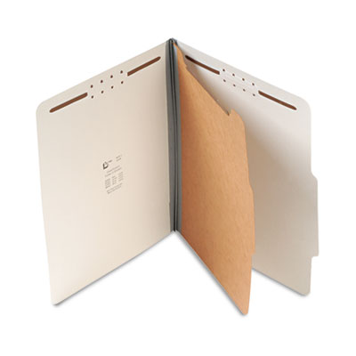 Subdivide files with 2" capacity metal fasteners inside front and back 25 pt. pressboard covers. One 17 pt. brown Kraft divider with double-sided 1" capacity fasteners. TyvekŪ gussets offer sturdy expansion. 2/5 cut top tabs in right of center position. Classification Folder Type: Top Tab; Size: Letter; Number of Sections: 4.