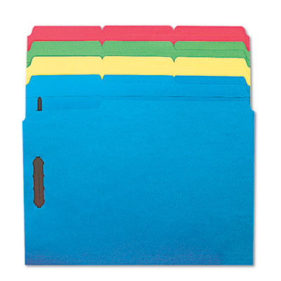 Hold papers securely and keep them in order with fasteners. Bright colors offer ways to sort and code different projects. Fasteners provide separate filing surfaces. Reinforced tabs for extra durability. File Folder Type: Top Tab; Size: Letter; Folder Material: 11 pt. Stock.
