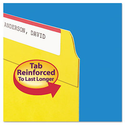Reinforced tabs for extra durability and longer life. Use color for categorizing File Folder Type: Top Tab; Size: Legal; Folder Material: 11 pt. Stock.