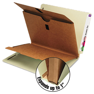 This hardworking design features an expanding wallet with VELCRO® closure, as well as a standard divider. Store electronic media, photos, any item that can't be hole punched, in the expanding wallet. 1" capacity prong fasteners on both sides of Kraft divider, and 2" capacity prong fasteners on inside covers. 25 pt. pressboard cover with matching Tyvek® gusset. Straight cut tabs on folders, 1/3 cut tab on divider (labels sold separately). Classification Folder Type: Recycled End Tab with Wallet; Size: Letter; Number of Sections: 5.