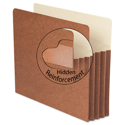 The iron man of file pockets, these pockets are virtually indestructible. Heavyweight front and back with a hidden poly reinforcement strip to improve strength. Tyvek® gussets extend into front and back panels twice as far as standard pockets. Manila lined for easy labeling. Fold-down front for easy access to contents. Expandable File Folder Type: Drop Front; Top Tab Pocket; Size: Letter; Width: 11 3/4".