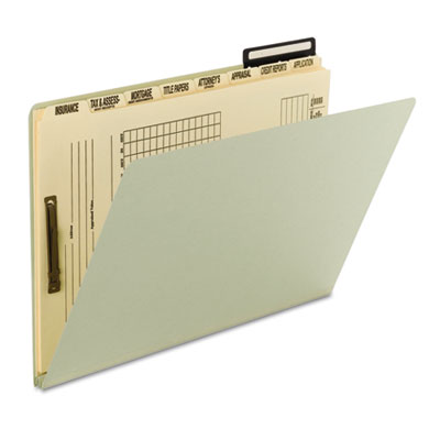 25 pt. pressboard cover contains eight 11 pt. Manila dividers (Insurance, Tax & Assessment Receipts, Mortgage, Title Papers, Attorney's Opinion, Appraisal, Credit Reports, Application). Front divider is printed with a form for mortgage applicant's information and inventory checklist. Includes pocket for papers that cannot be punched. Matching color Tyvek® tape. Includes flat metal tab and insert, and fastener compressor. Classification Folder Type: Mortgage; Size: Legal; Number of Sections: 8.