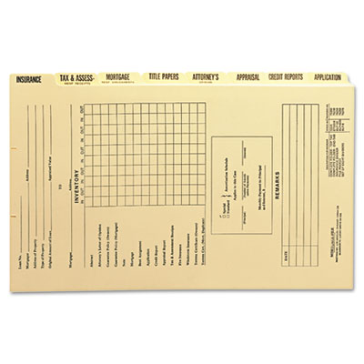 25 pt. pressboard cover contains eight 11 pt. Manila dividers (Insurance, Tax & Assessment Receipts, Mortgage, Title Papers, Attorney's Opinion, Appraisal, Credit Reports, Application). Front divider is printed with a form for mortgage applicant's information and inventory checklist. Includes pocket for papers that cannot be punched. Matching color Tyvek® tape. Includes flat metal tab and insert, and fastener compressor. Classification Folder Type: Mortgage; Size: Legal; Number of Sections: 8.