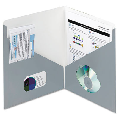 These contemporary colored two-pocket folders are made of a durable satin finish paper stock which provides a clean vibrant look. The two-pocket folders have generous slash pockets. Reinforced at the sides with a glue flap, the left pocket is die-cut to hold a business card and tri-fold documents, the right pocket is die-cut for electronic media. Front Cover Color(s): Blue Gray; Back Cover Color(s): Blue Gray; Sheet Size: 11 x 8 1/2.