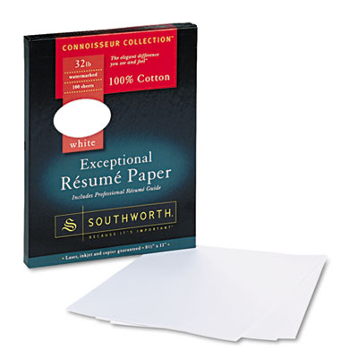 Nothing equals the rich texture of 100% cotton paper. Its distinctive crispness provides a feeling of substance that makes both an immediate and lasting impression. Laser, inkjet and copier compatible. Watermarked and date-coded. Acid- and lignin-free. Endorsed by the National Résumé Writers Association. Size: 8 1/2 x 11; Paper Color(s): White; Paper Weight: 32 lb..
