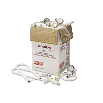 Do your part to properly recycle with this cost-effective solution. Includes everything you need—simply order, fill, seal and ship. Kit contains a UN-rated, DOT-approved container, inner poly liner and tie, instructions, terms and conditions and prepaid shipping label. Also includes Proof of Purchase Serial Number and access to online certificates of recycling. Holds 22 T12 or 32 T8 u-tubes; 250 compact fluorescent lamps. Waste Receptacle Type: Recycling; Material(s): Corrugated Cardboard; Application: Mixed Lamps.