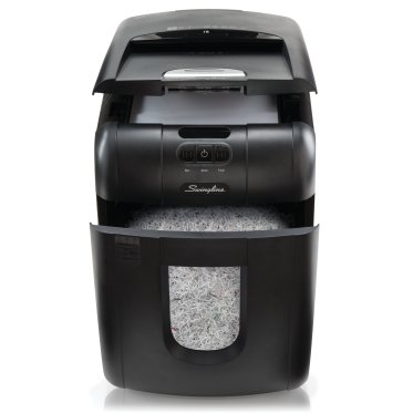 By eliminating the need to manually feed papers, you can work on other tasks while the shredder shreds for you. The 100M model can automatically micro-cut shred as many as 100 sheets, including those fastened with paper clips or staples. Simply insert a stack of 100 letter size sheets into the autofeed tray, shut the lid, and you're done. For glossy papers and crumpled or folded sheets a manual shredding slot is also included, which shreds up to 6 sheets at once. Manual feeding is also required for credit cards. The 100M is a micro-cut shredder, delivering Level P-5 high security that is suitable for shredding confidential documents including sensitive financial or personal identity information. One sheet of paper is shredded into approximately 2000 pieces and caught in a 7-gallon waste bin. The Swingline® Stack-and-Shred™ 100M Hands Free Shredder is an innovative, automatic shredder that simplifies shredding to help you get more things done during your day.