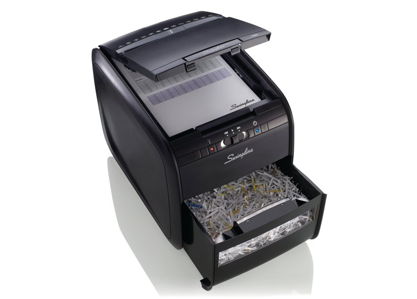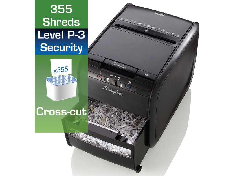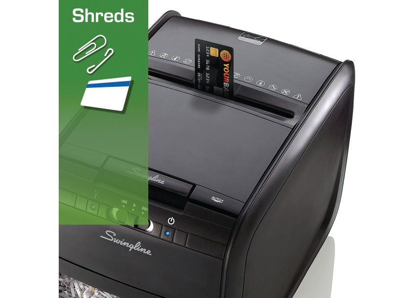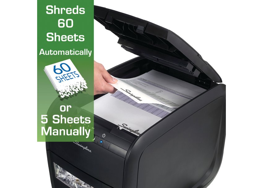 Upgrade to America's #1 Selling Brand in Hands Free Shredders and benefit from stack, shut, done operation. Insert up to 60 sheets and walk away - the personal Swingline® Stack-and-Shred™ 60X will automatically shred all 60 sheets for you. A manual feed option is also included for quick cross-cut shredding of credit cards or small tasks of 5 sheets or less.