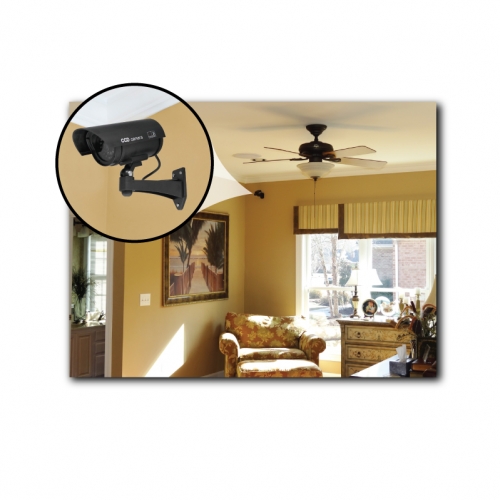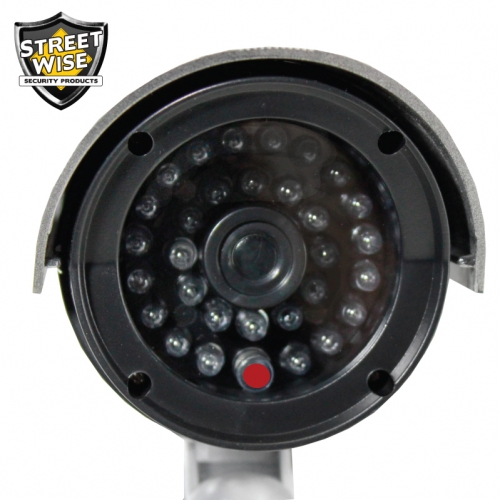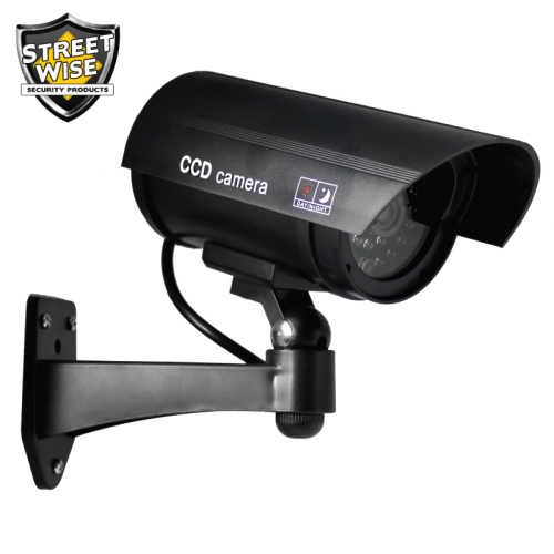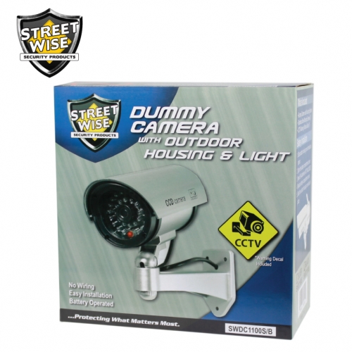 Now you can deter robbery and theft and vandalism without the high cost of a real security camera. When placed in your home or business even the most sophisticated criminals will think the premise is guarded by a high-tech surveillance system and go in search of an easier target. In fact this is an actual surveillance camera that has been modified into a dummy or fake security camera. This unit does contain a flashing light. Comes in to color options (SWDC1100B, SWDC1100S) Design: This camera is an actual surveillance camera Noticeable: highly visible during the day and at night the flashing red LED light guarantees that it will be noticed. The dimensions (including the rain shield and bracket) are 10 inches x 6 inches x 7 inches. Installs quickly and easily using the included stainless steel screws. Requires two AA Batteries