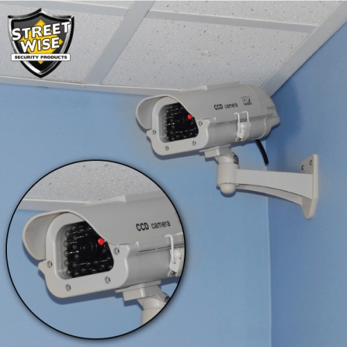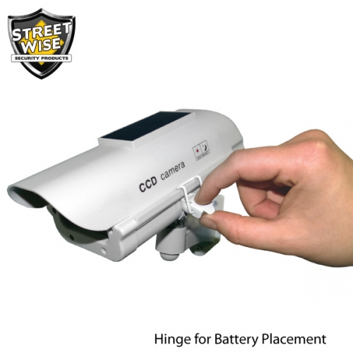 Now you can protect your premises and the environment at the same time with the solar powered 7" IR Dummy Camera in Circular Outdoor Housing. It can deter robbery, theft or vandalism without the high cost of a real security camera. When placed in your home or business even the most sophisticated criminals will think the premises is guarded by a high-tech surveillance system and go in search of an easier target. Rain Shield so this camera can be used anywhere.The flashing LED light can be powered by the sun (which charges the included rechargeable batteries). The dimensions (including the rain shield and bracket) are 10 inches x 6 inches x 7 inches. Installs quickly and easily using the included stainless steel screws. Requires two AAA Batteries if used inside