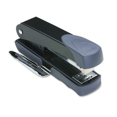 Quality performance in a compact design. Staples, pins and tacks. Built-in staple remover and name plate. Sturdy steel construction with soft touch material for stapling comfort. 2 1/2" throat depth. Top loads a half strip (105) of 1/4" arched crown staples. Stapler Type: Compact Desktop; Staple Capacity: Half Strip (105 Staples); Size of Staple Used: 1/4".