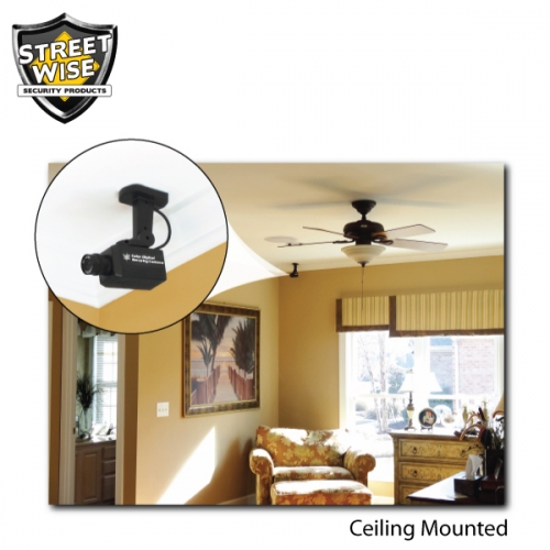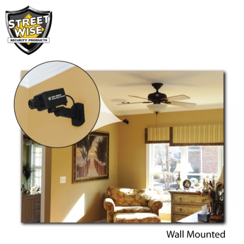 Our lowest priced panning dummy camera has been improved. It is now all black, and comes with 2 optional stickers for both sides to increase the realism. Now, the SWMADC (formerly C1463), is even more effective at deterring robbery, theft, and vandalism without the high cost of a real surveillance camera. Motion Activated: Startles an intruder by panning back and forth and flashing a red light when motion is detected. Deters robbery, theft, and vandalism without the high cost of a real security camera. Place in your home or business to cause would-be thieves to of in search of an easier target. Even the most sophisticate criminals will think that the premises is guarded by a high-tech surveillance system. The red flashing light and panning motion draws extra attention to the camera and increases its realism. Easily mounts to a ceiling or wall. Optional stickers can be put on the sides of the camera to increase realism. The camera measures 5 inches x 2 inches x 2 inches (excluding the mounting bracket). Requires Three AA Batteries