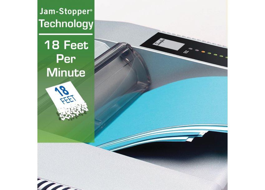 - Jam-Stopper® detects shredder jams and automatically reverses excess papers; lights indicate if paper capacity is exceeded