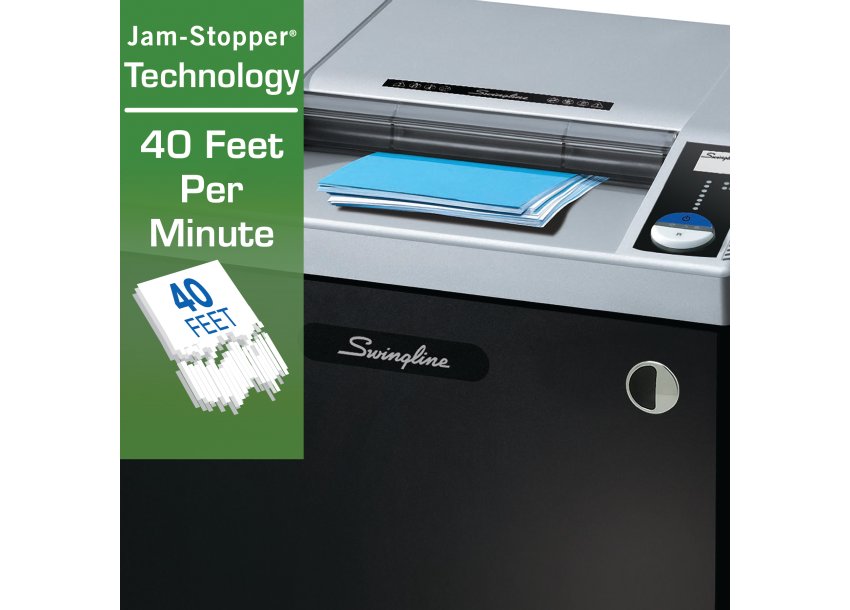 - Jam-Stopper® detects shredder jams and automatically reverses excess papers; lights indicate if paper capacity is exceeded
