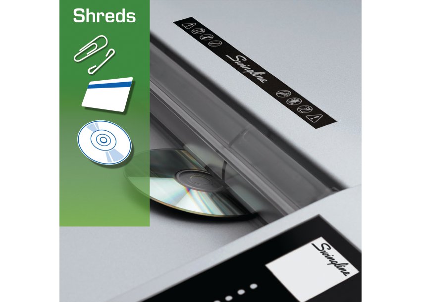 - Shreds DVDs, CDs, credit cards, paper clips and staples
