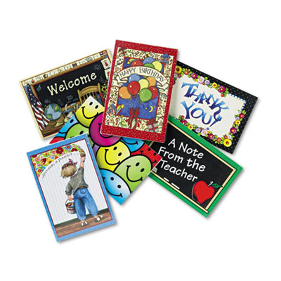 Colorful assorted design postcards make notes quick and easy to write, inexpensive to send. 30 postcards per design: welcome, happy birthday, thank you, anything is possible, smiley faces and a note from your teacher. Paper Color(s): Assorted; Card Height: 4"; Card Width: 6".