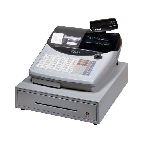 Casio TE-2400 Cash Register. Electronic Cash Register with Multi-Line Display. Simple yet powerful features and functions increase efficiency of store management and improve productivity. Pop-up 8-digit numberic LED / Compact Flash Card Interface / Two-station thermal printer.