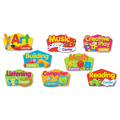 Playful images provide visual cues for these bright, easy-to-read signs. Use to designate classrooms or special areas. Includes Creative Play, Music, Building, Listening, Art, Reading, Math and Computer. Eight pieces up to 13".
