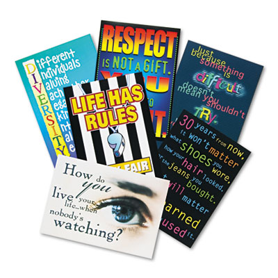 Create themed displays with the most popular large posters in value-priced combo packs. Display them together to motivate students, reinforce positive behavior and sustain interest in learning. Versatile and durable for years of use. Six different 13-3/8 x 9 posters per pack. Life Has Rules, Respect Is Not A Gift, Just Because Something Is Difficult, How Do You Live Your Life, Different Individuals, 30 Years From Now. Poster Type: Motivational Print; Width: 9"; Height: 13 3/8".