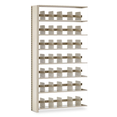 Save 50% of the floor space used by conventional files. For highly active files and records. "T" shaped upright attaches to Starter Set to join units. Use with Starter Sets for a complete wall system. Includes adjustable 12" deep shelves, shelf supports and five file dividers per shelf. 200- to 300-lb. load capacity per shelf with weight evenly distributed. Heavy-duty rolled steel construction with sand finish. Color: Sand; Overall Width: 48"; Overall Depth: 12".