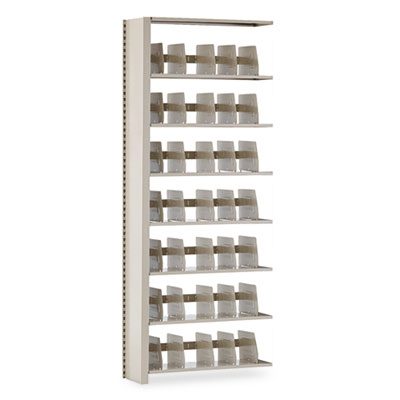 Save 50% of the floor space used by conventional files. For highly active files and records. "T" shaped upright attaches to Starter Set to join units. Use with Starter Sets for a complete wall system. Includes adjustable 12" deep shelves, shelf supports and five file dividers per shelf. 200- to 300-lb. load capacity per shelf with weight evenly distributed. Heavy-duty rolled steel construction with sand finish. Color: Sand; Overall Width: 36"; Overall Depth: 12".