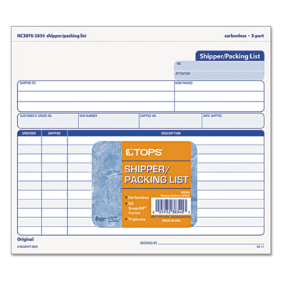 TOP3834 Snap-Off Shipper/Packing List, 8 1/2 x 7, Three-Part Carbonless, 50 Forms By TOPS BUSINESS FORMS