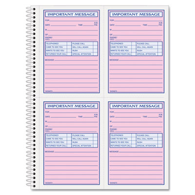Quick check-off style with special area for fax and mobile phone numbers. Space for important phone numbers. Copies remain in book as permanent record. Form Size: 3 7/8 x 5 1/2; Forms Per Page: 4.