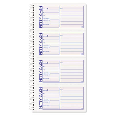 Spiralbound book keeps permanent record of cash disbursements. Space for date, amount, approval, account, and number. Six writing lines to state purpose of petty cash. Form Size: 2 3/4 x 5; Forms Per Page: 4.