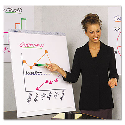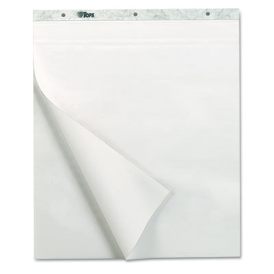 Adhesive adheres to most surfaces; removes and repositions easily without damage or residue. Paper resists marker bleed-through. Plain white. Allows for portability; built-in handle makes carrying easy. Pad Type: Easel; Sheet Size: 25" x 30"; Ruling: Unruled.