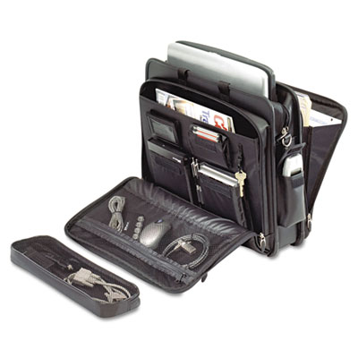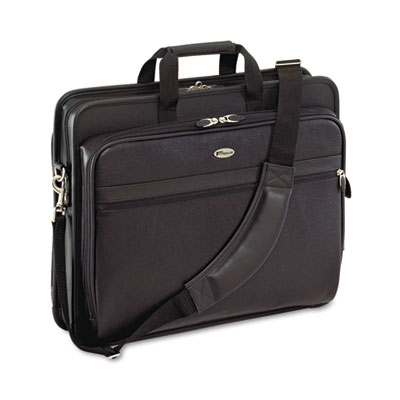 Zip-down workstation includes pockets for PDA, pens, business cards, accessories and key clip. Expanding file section. Includes removable mesh accessory pouch and side cell phone pocket. Detachable shoulder strap. 17" max. screen size. For Device Type: Notebook; Material(s): Leather; Carrying Method: Handle;Shoulder Strap.