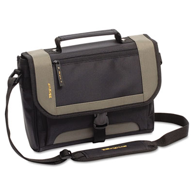 - Features zippered front pocket, interior workstation with pen loops and accessory pockets, padded/removable shoulder strap.