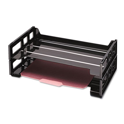 Simple meets smart in this solution to document management. Ribbed design prevents static build-up so papers glide easily in and out of trays. Self-stacking. 2 3/4" high. Two trays per pack. Desk Tray Type: Two-Tier Side Load; Holds Paper Size: Legal; Width: 16 1/4".