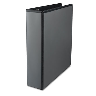 Create the perfect title page, then place it inside the see-through plastic overlay. Wide base rings lock in place to hold pages securely. Two inside pockets for additional storage of loose documents. Included card stock spines are easy to remove, reverse and re-use. Back mounted with exposed rivets on spine. 3˝” pockets. Capacity Range [Max]: 2"; Sheet Capacity: 375; Color(s): Black.
