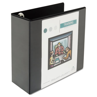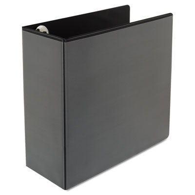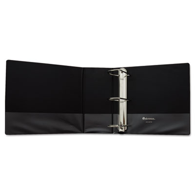 Snag-free rings open with a single touch. Combination of suede grain vinyl over heavyweight board provides an attractive and sturdy binder. Frosty clear top opening overlays on all exterior panels allow total customization. Interior 3 1/2" deep pockets are frosty clear for easy visibility of loose documents. Extra-wide covers will accommodate a tabbed index. Includes stiff spine insert for easy insertion and removal. Capacity Range [Max]: 5"; Sheet Capacity: 950; Color(s): Black.