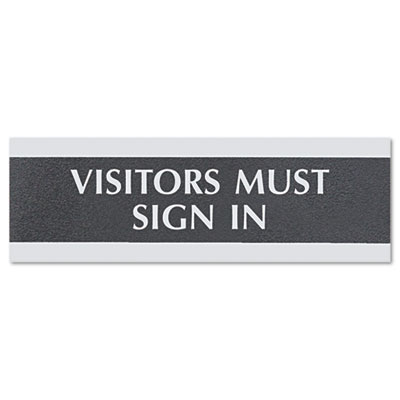 USS4763 Century Series Office Sign, "Visitors Must Sign In", 9 x 3, Black/Silver By U. S. STAMP & SIGN
