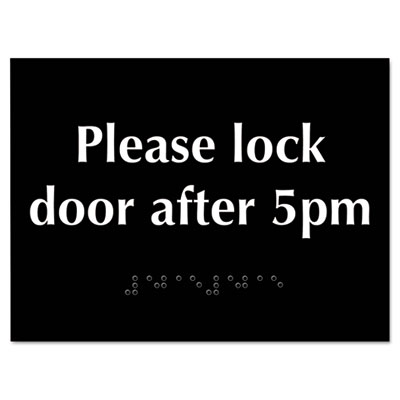 Custom messages and Braille manufactured to your specifications. Braille is raised and integrated with the background for a sturdy and vandal-resistant alternative. Durable material stands up to high traffic areas. Includes very high bond tape for easy installation. 1/8" thickness. Assorted colors. Width: 8"; Height: 6".
