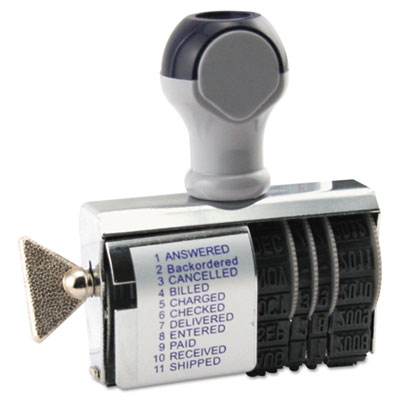 Just turn the dial for easy access to date and eleven common office phrases. Four bands produce 10 years of dates. Requires separate ink pad. Stamp Type: Message Dater; Message(s): Date plus 11 common business phrases; Ink Types: Conventional.
