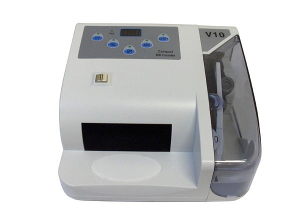 The Intelli-Count V-10 is a compact bill counter and counterfeit detection station in one. The right side of this machine features a compact bill counter that can handle a stack of bills (200 new / 100 old) and count them at a speed of up to 600 bills per minute. When not in use, a dust cover can be folded up and put in place to help protect internal electronics. This machine also includes a magnetic ink scanner (top of the machine), a backlit watermark light (front of machine) and a UV light (middle of machine). All together, this machine is perfect for retail environments with light to medium-volume counting and counterfeit detection needs. This is a great option for businesses on a budget. Buy yours from USA Office Machines today!