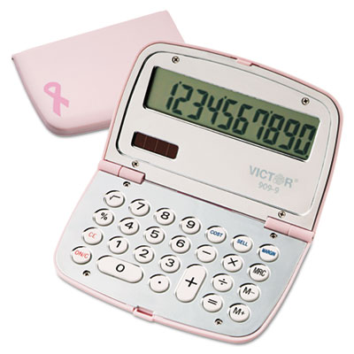 Show your support for breast cancer awareness with this pink compact calculator. Cost/sell/margin, square root, 3-key independent memory and percent key features provide more functionality than your basic pocket calculator. Extra large 10 digit LCD display for easy viewing. Energy-saving dual power--battery and solar. A great calculator supporting a great cause. A portion of the proceeds goes to help fund research and development in the fight against breast cancer. Power Source(s): Battery;Solar; Display Notation: Numeric; Number of Display Digits: 10.