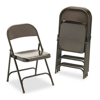 Choose a folding chair designed for quick setup and compact storage. Contoured seat and back improve comfort levels. Sturdy steel frame with front and back U-braces stands solid and firm. Reinforced hinges withstand the stress of repeated opening and folding. Plastic foot caps protect flooring. Recommended Applications: Breakroom & Hospitality; Seat/Back Color: Mocha.