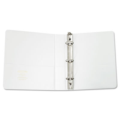 Customizable covers and spine allow you to create the perfect presentation. Round ring mechanism with open and close triggers for easy access to documents. Back-mounted rings allow pages to lie flat. Two inside pockets for storage of loose paper. Capacity Range [Max]: 1"; Sheet Capacity: 175; Color(s): White.